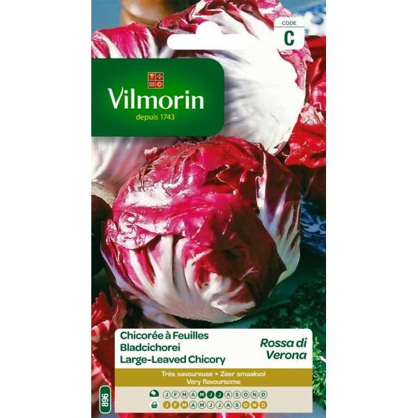 Deze variëteit Rode van Verona produceert mooie bladeren met een robijnrode kleur en brengt kleur in uw salades tijdens de winter en de lente. Wordt geoogst als sla tijdens de herfst of als krop tijdens de lente.
