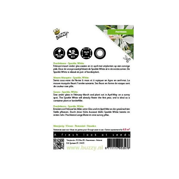 Gaura Sparkle White of prachtkaars is een meerjarige, luchtige plant die ongeveer 80 cm hoog wordt. Een prachtige zomerbloeier met mooie witte bloemen. Ze lokken ook heel wat bijen naar de tuin. De plant staat bij voorkeur op een zonnige plaats en is goed te combineren met siergrassen.