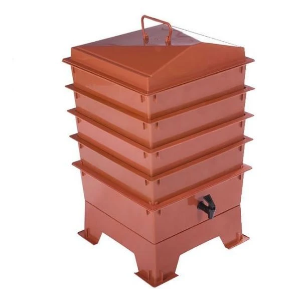 De wormenbak bestaat uit vier stapelbare geperforeerde afvalschalen. Het afval wordt samen met de wormen in de bovenste schaal onder het deksel geplaatst. De wormen zullen het afval in een reukloos enzymatisch proces omzetten tot een voedzaam substraat en compostthee of wormenextract. De vier afvalschalen zorgen ervoor dat je ze onderling kan gaan verwisselen naargelang het materiaal is gecomposteerd zodat er telkens een lege schaal bovenop komt te staan. De wormen migreren vervolgens doorheen de geperforeerde bodem.